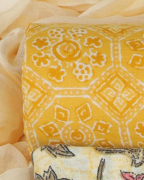 Cotton blend kurta and pant fabric Color fast print Shiffon dupatta All over print Can be stitched upto XXL .