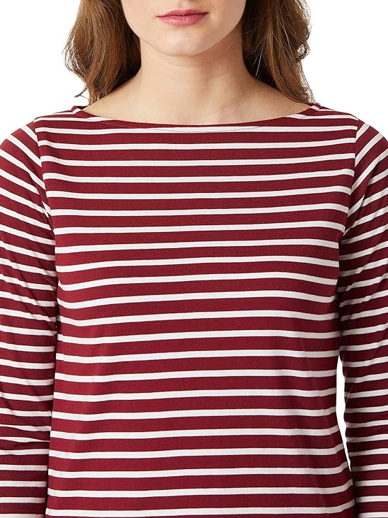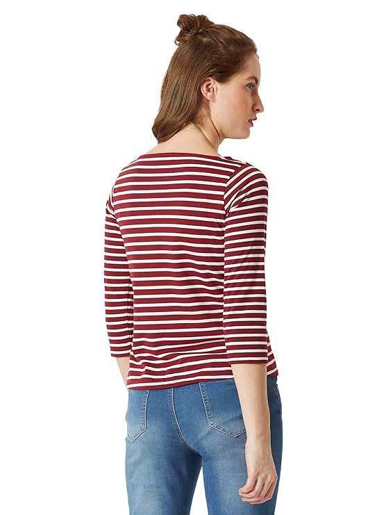 Maroon and white striped cotton regular fit T-Shirt and top, has boat neck and three quarter sleeves.