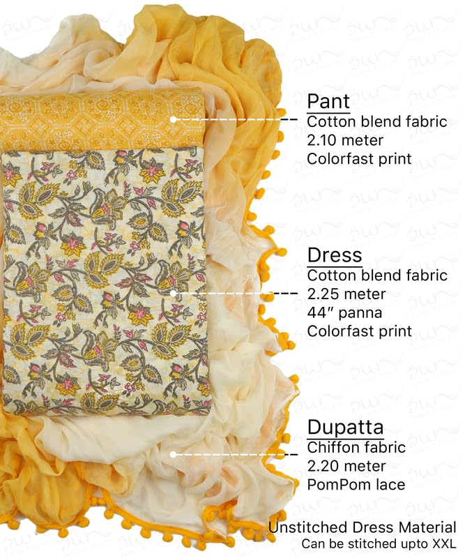 Cotton blend kurta and pant fabric Color fast print Shiffon dupatta All over print Can be stitched upto XXL .